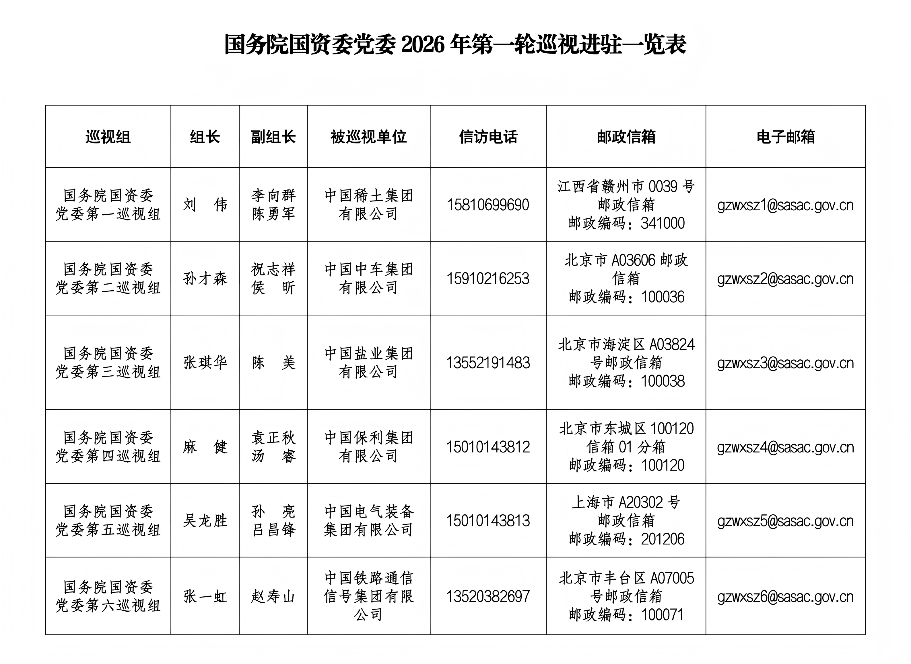 按照國務院國資委黨委和巡視工作領導小組部署安排,截至2026年4月10日,國務院國資委黨委2026年第一輪巡視完成進駐工作。國務院國資委黨委6個巡視組將對中國鹽業集團有限公司、中國稀土集團有限公司、中國中車集團有限公司、中國鐵路通信信號集團有限公司、中國保利集團有限公司、中國電氣裝備集團有限公司等6家企業黨委開展常規巡視。