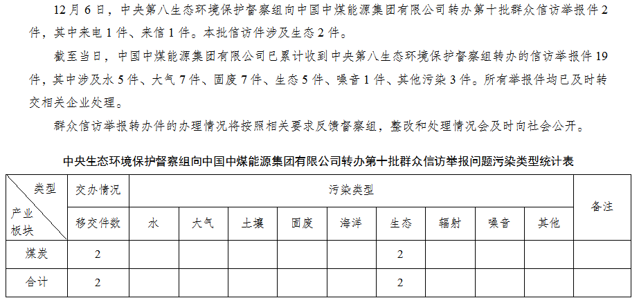 中央第八生態(tài)環(huán)境保護(hù)督察組向中國中煤能源集團(tuán)有限公司轉(zhuǎn)辦第十批群眾信訪舉報件