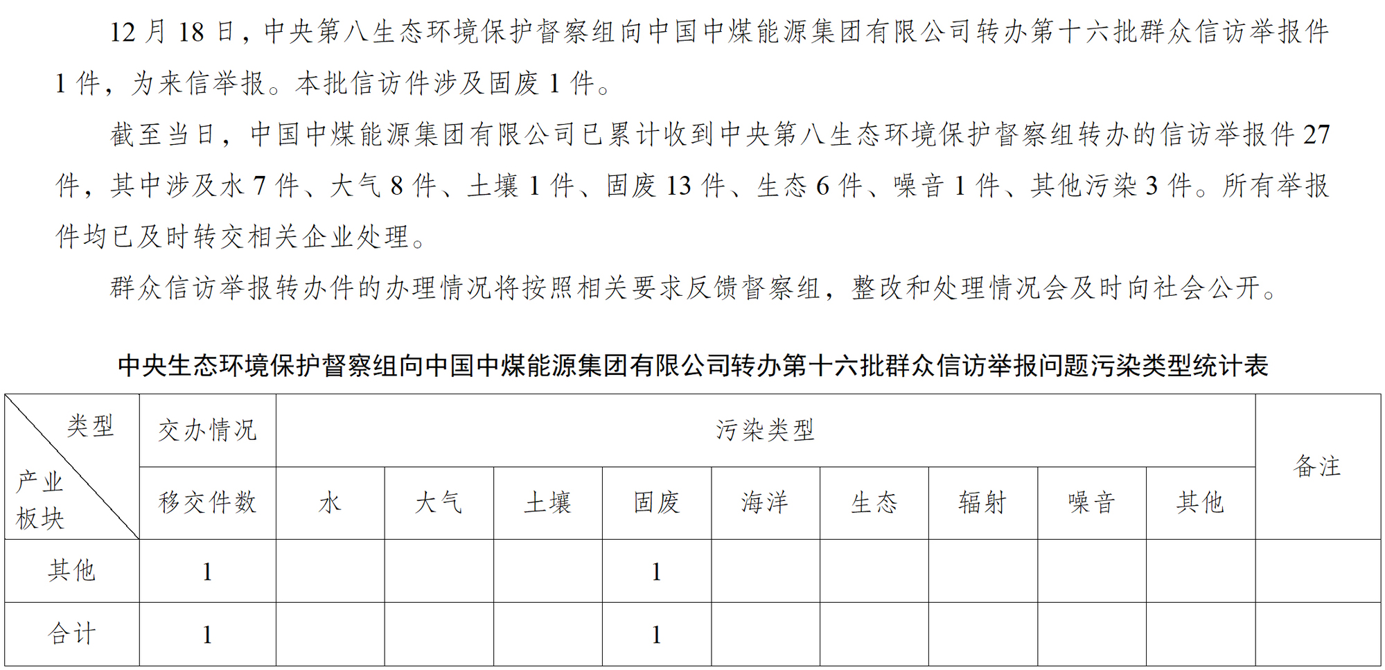 中央第八生態環境保護督察組向中國中煤能源集團有限公司轉辦第十六批群眾信訪舉報件